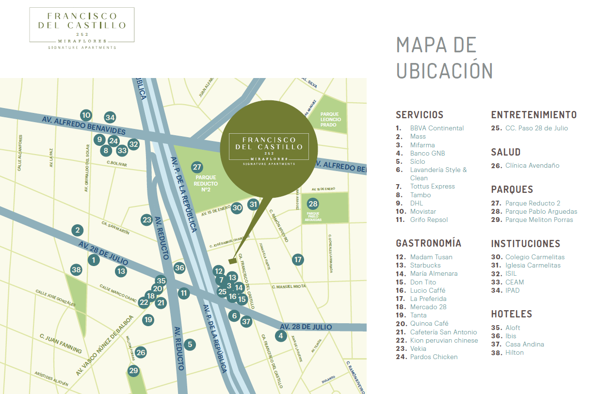📍 Ubicación: Calle Francisco del Castillo 252 – Miraflores. Conectividad con Av. Benavides, Av. 28 de Julio, Av. Paseo de la República y Av. Reducto.