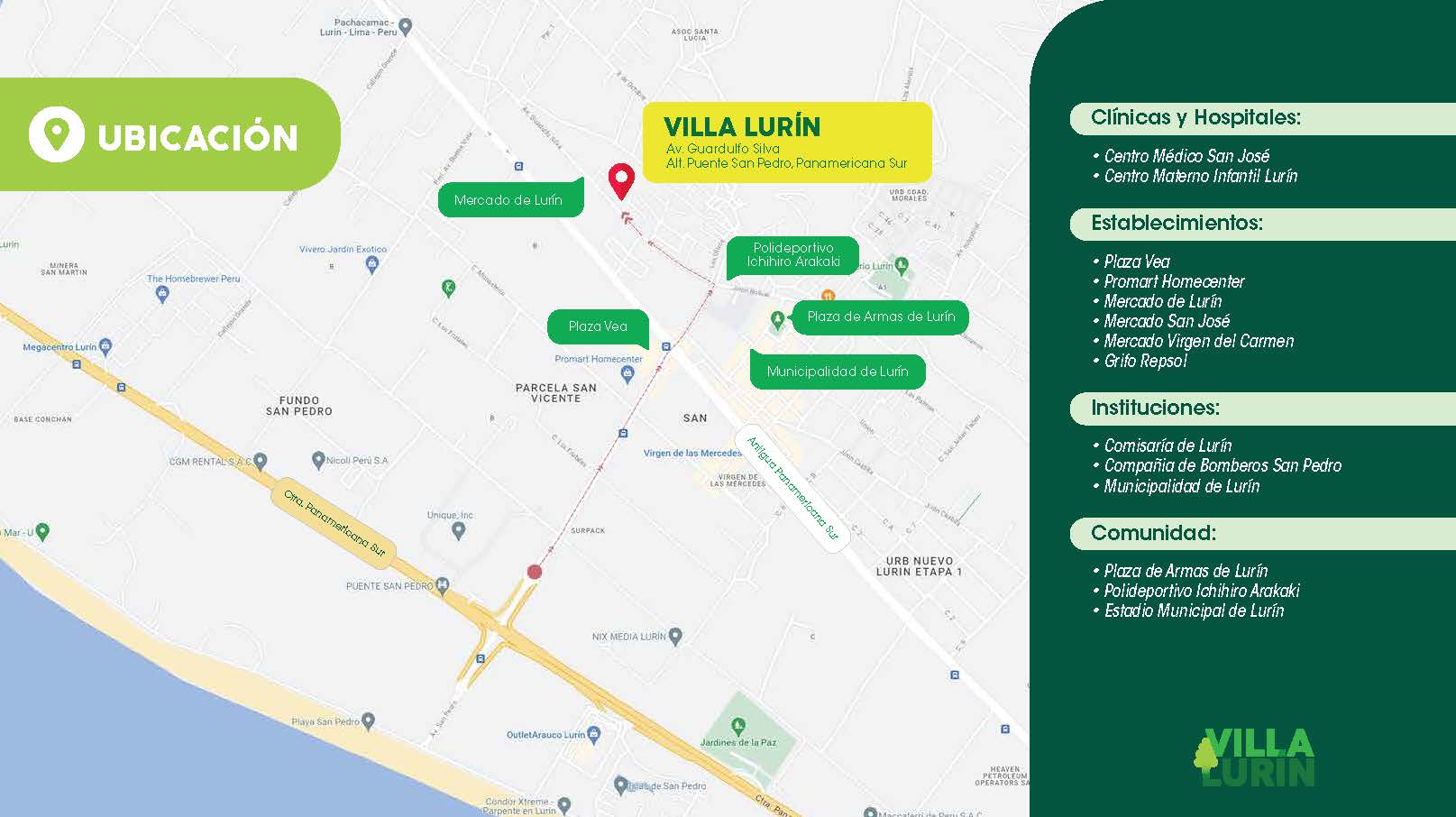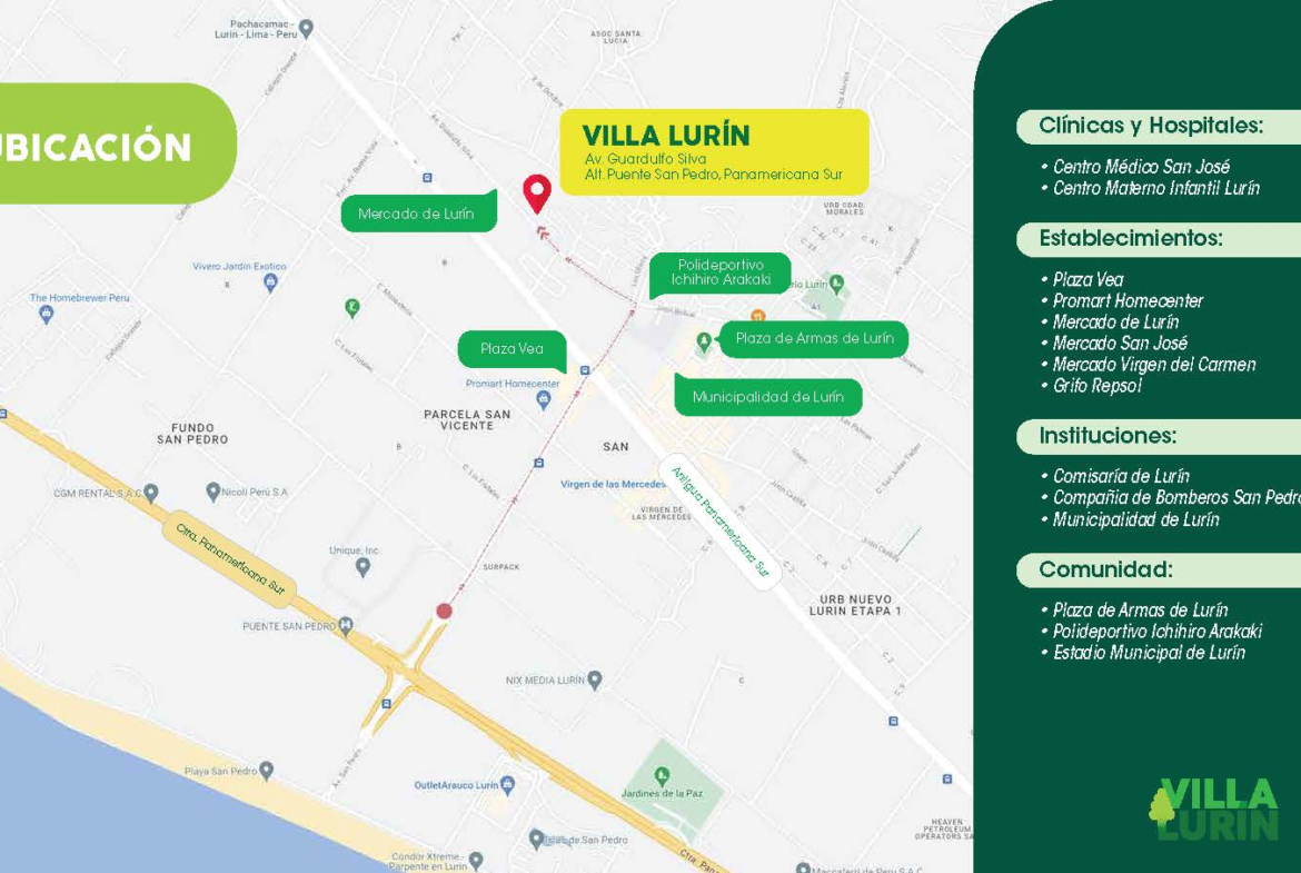 - Lotes en venta en Urbanización Villa Lurin, ubicada a tan solo 30 minutos de la ciudad de Lima y a 5 minutos de la carretera Panamericana Sur, entre las avenidas Guardulfo Silva y Puente San Pedro. Altura Puente San Pedro, Panamericana Sur, Km 31.